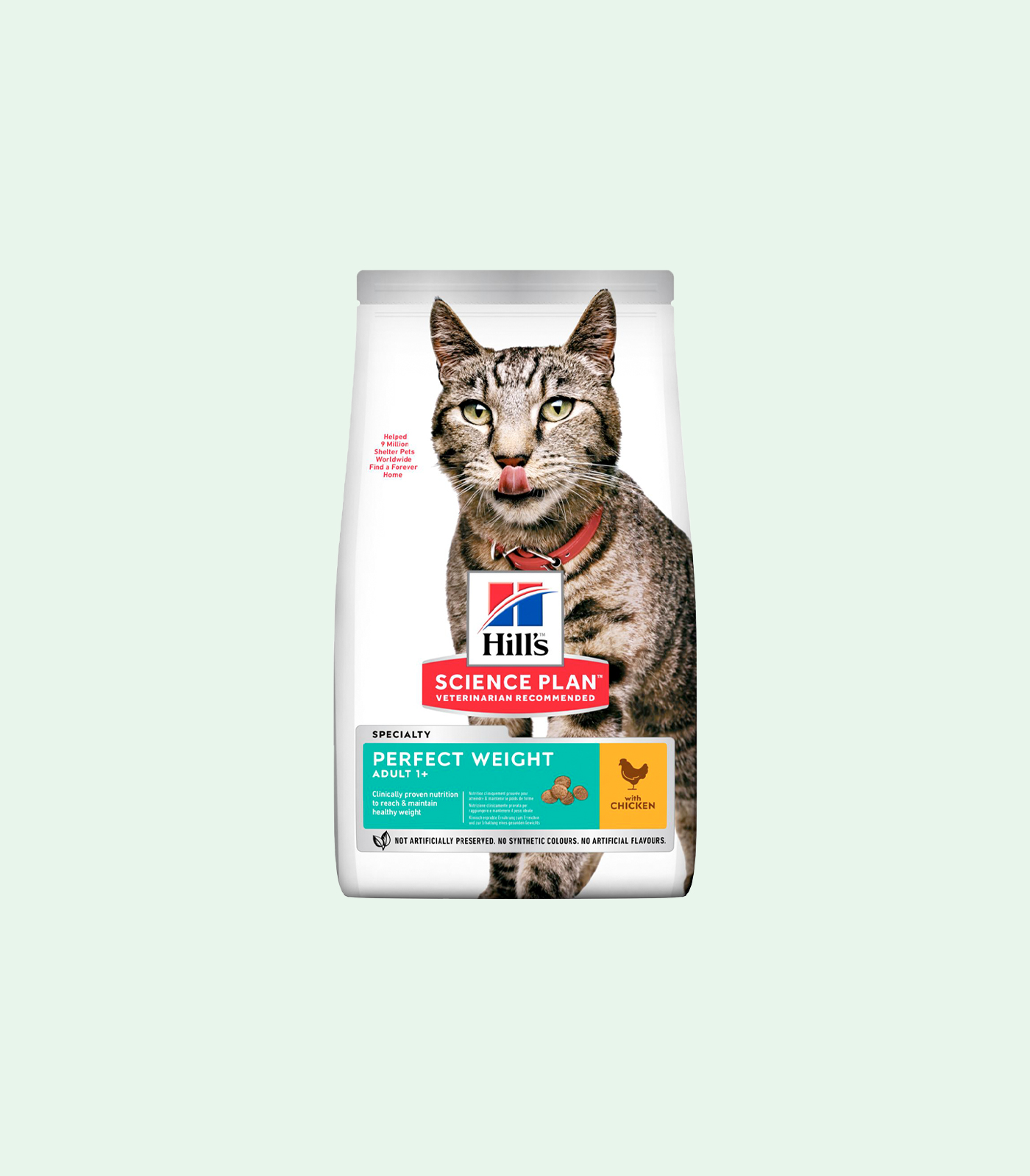 Hill’s? Science Plan? Feline Adult Perfect Weight with Chicken is precisely balanced nutrition to help cats achieve a healthy weight for a longer, happier life. Also suitable for sterilised cats. Science Plan? Perfect Weight has a unique blend of ingredients and low fat content. Formulated to help your cat achieve healthy weight for longer life expectancy. Clinically proven nutrition to help cats achieve a healthy weight. Formulated to help keep the weight off. Prebiotic fibres to support nutrient absorption and gentle digestion. No added artificial flavours, colours or preservatives.