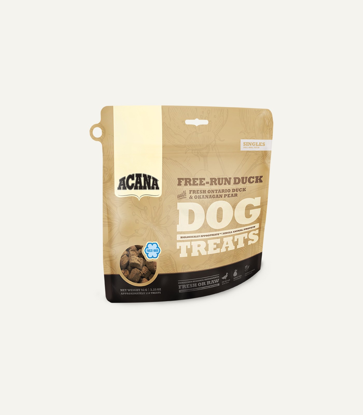 Loaded with goodness and full of natural flavour, ACANA Free-Run Duck treats contain one easily digestible animal protein, so you can reward your dog according to his evolutionary needs.