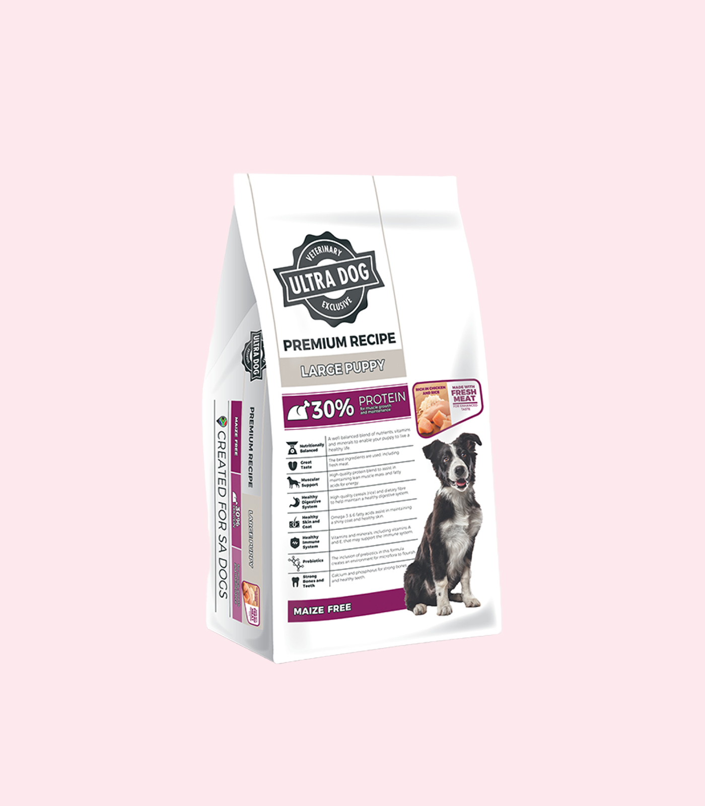 Ultra Dog Premium Recipe dry dog food for Large puppies is maize-free and has been scientifically developed in conjunction with our in-house experts. It contains protein from high-quality poultry meal and fresh meat for enhanced taste. This amino acid forms the building blocks for strong muscles and muscle growth and is combined with the correct balance of fats and carbohydrates to ensure that puppies reach their full potential & enjoy healthier, active lives