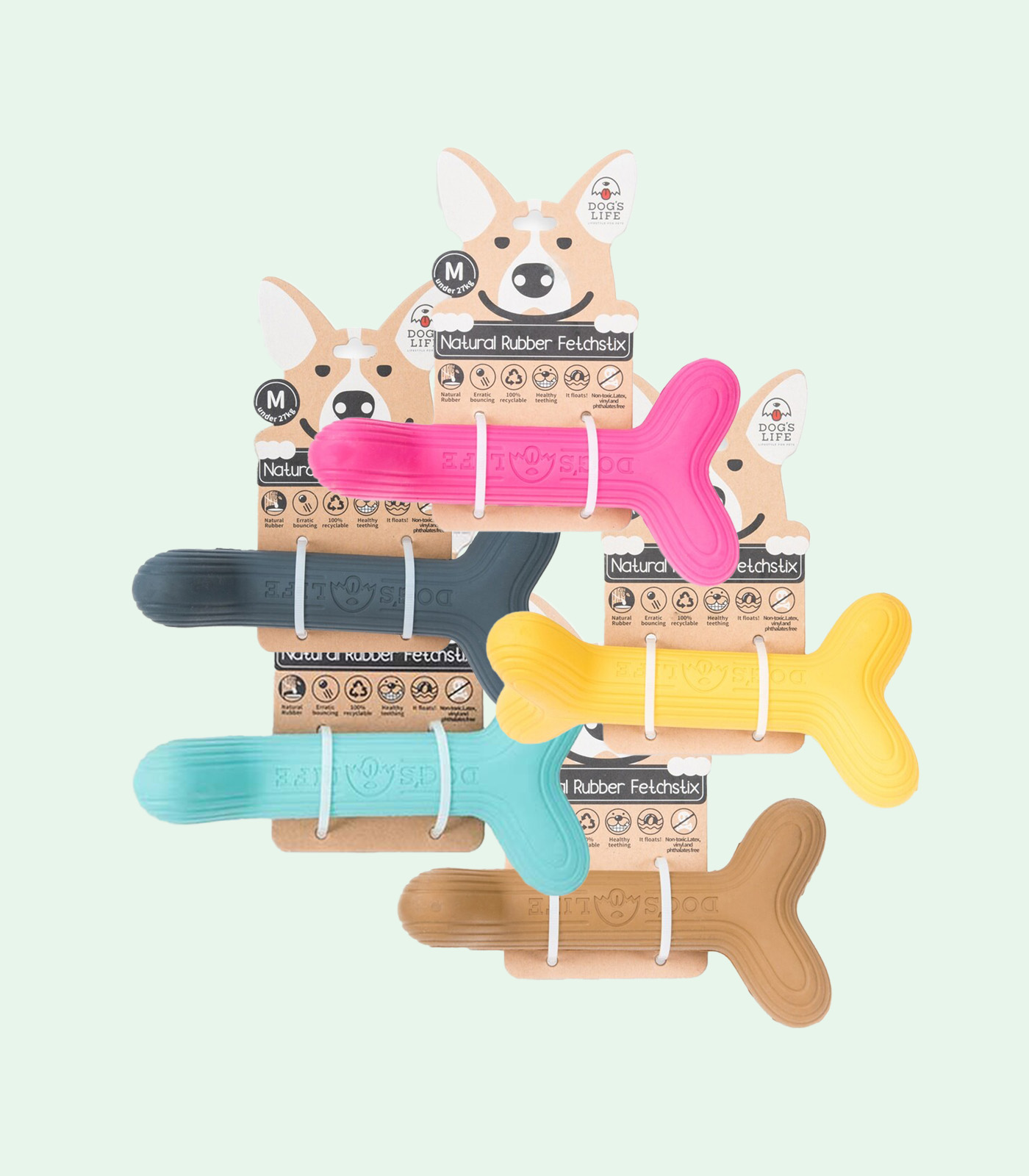 The Dog?s Life FetchStix is made with natural rubber from the sap of rubber trees, so it’s non-toxic and 100% biodegradable. They?re free of any harmful chemicals like BPA, phthalates, latex and vinyl and are super fun to play with! They?re durable and fun for moderate chewers and persistent chewers who like the springy resistance of this more flexible chew toy. Durable, natural rubber retains shape and stands up to tough chewing.