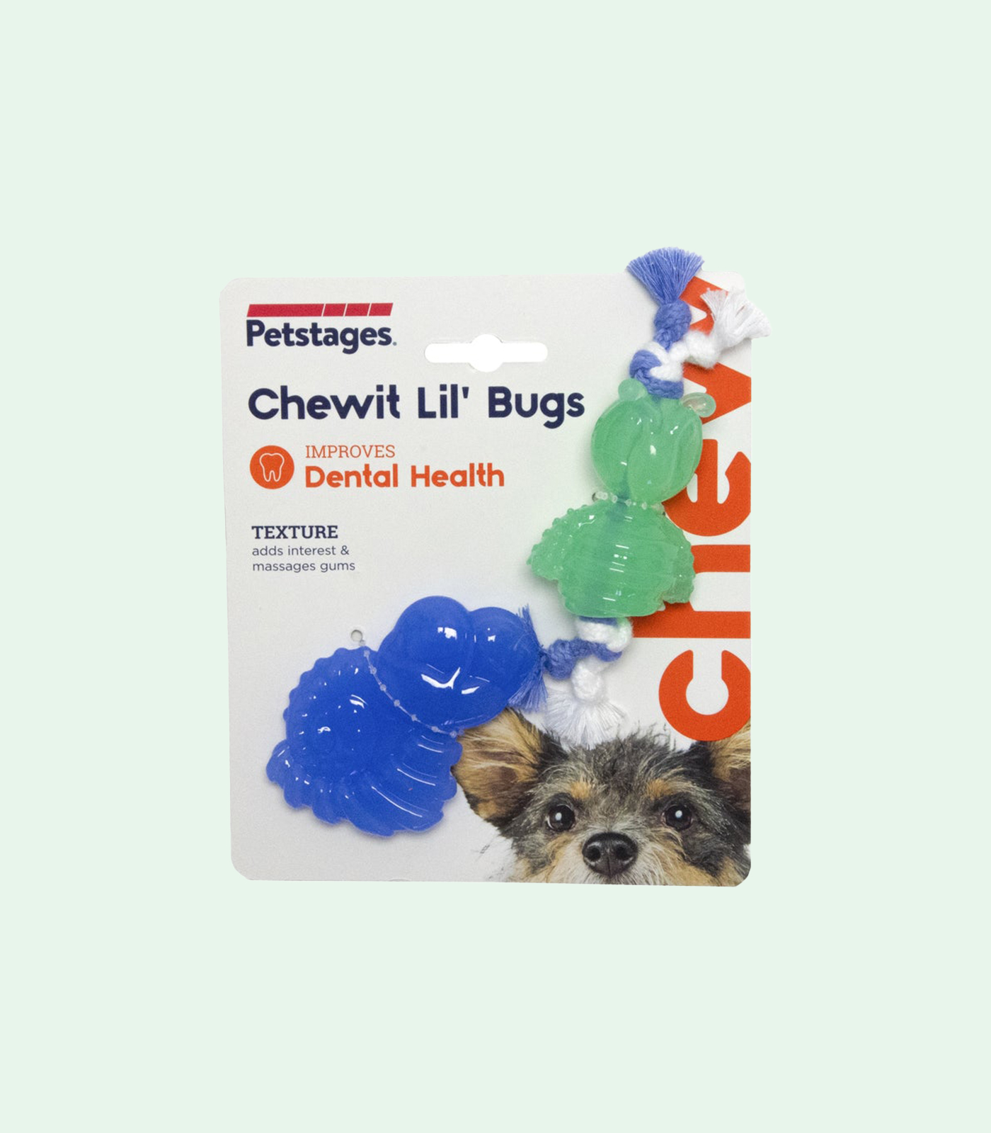 The Petstages Chewit Lil’ Bugs are designed with flexible rubber and multiple textures that help massage gums. Knotted rope ends remove tartar and floss your pup’s teeth as they chew and play.