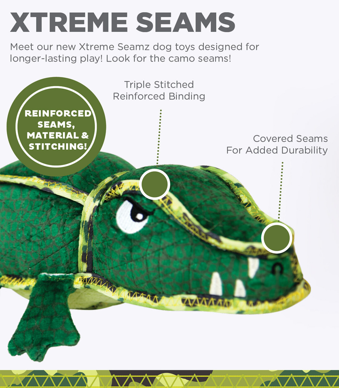 Our toughest toy yet:?Meet our new Xtreme Seamz dog toys designed for longer-lasting play! Our 8 NEW animal shapes with camo binding come in 2 different sizes making them a great toy for any size dog and are machine washable!