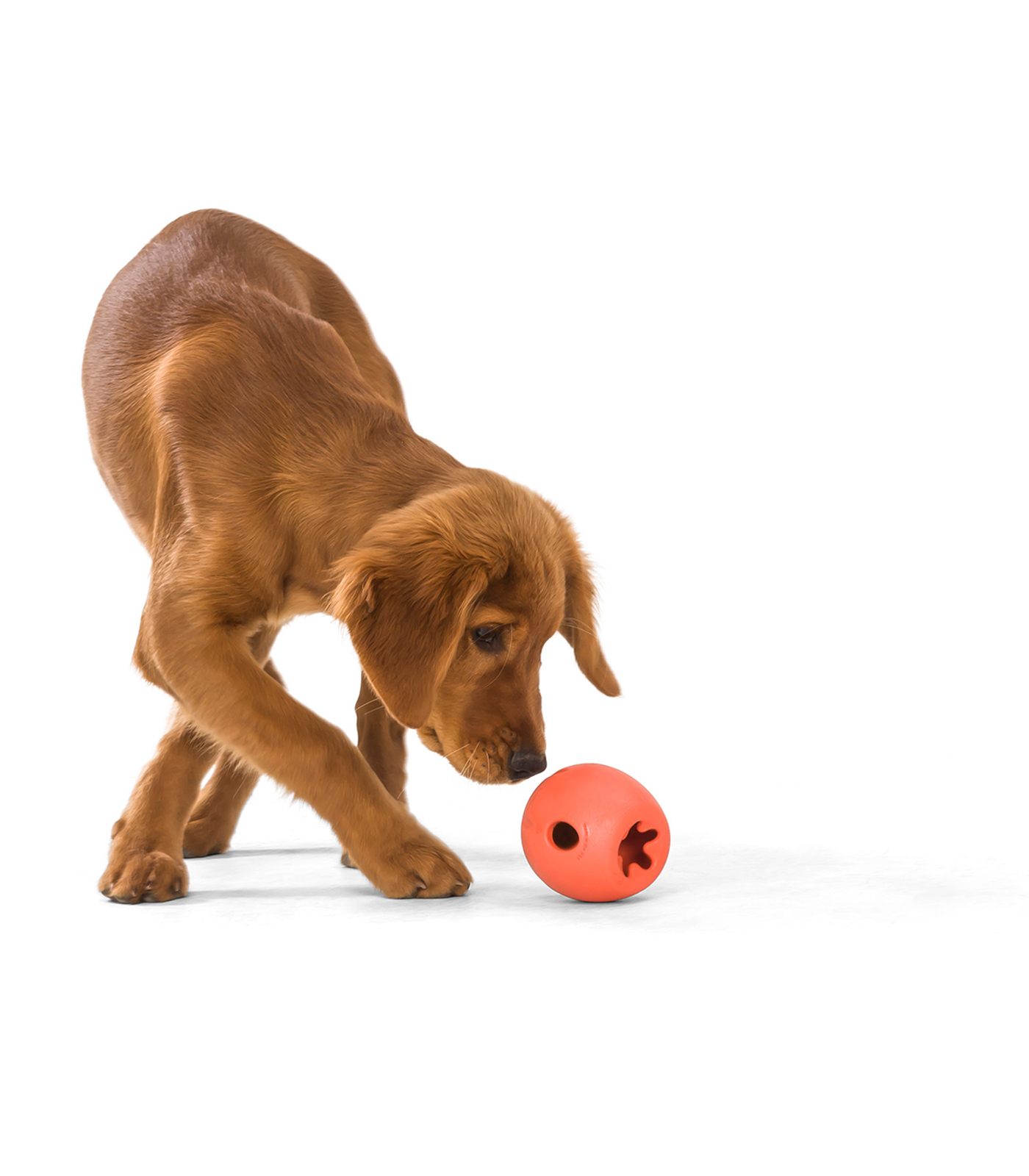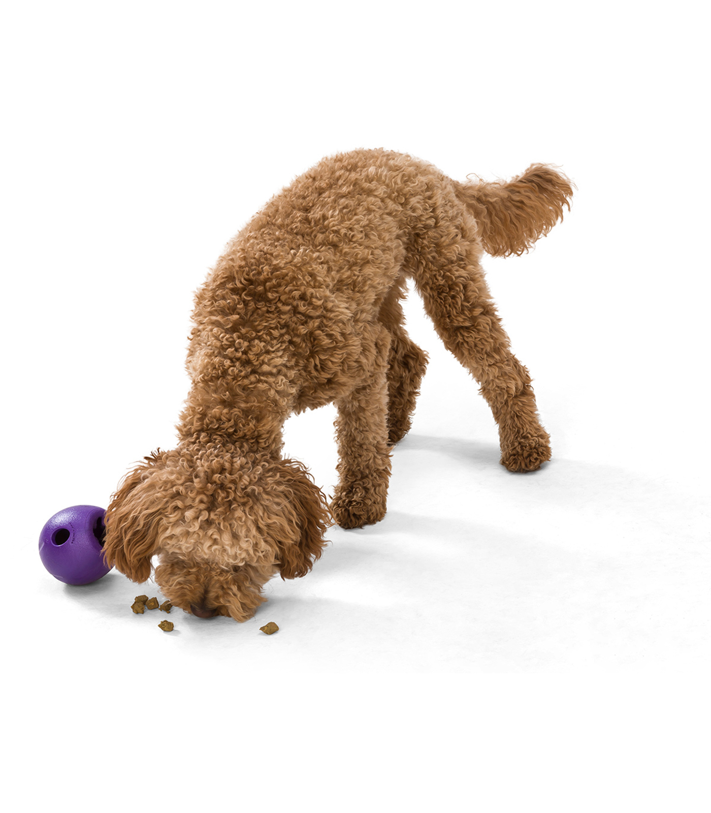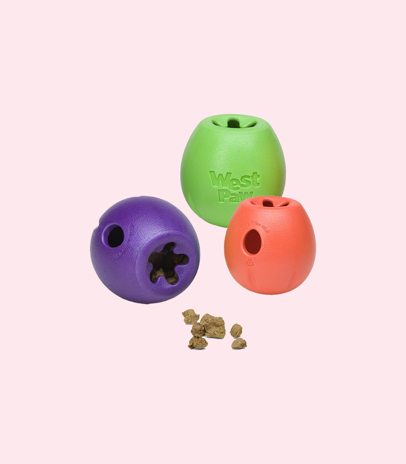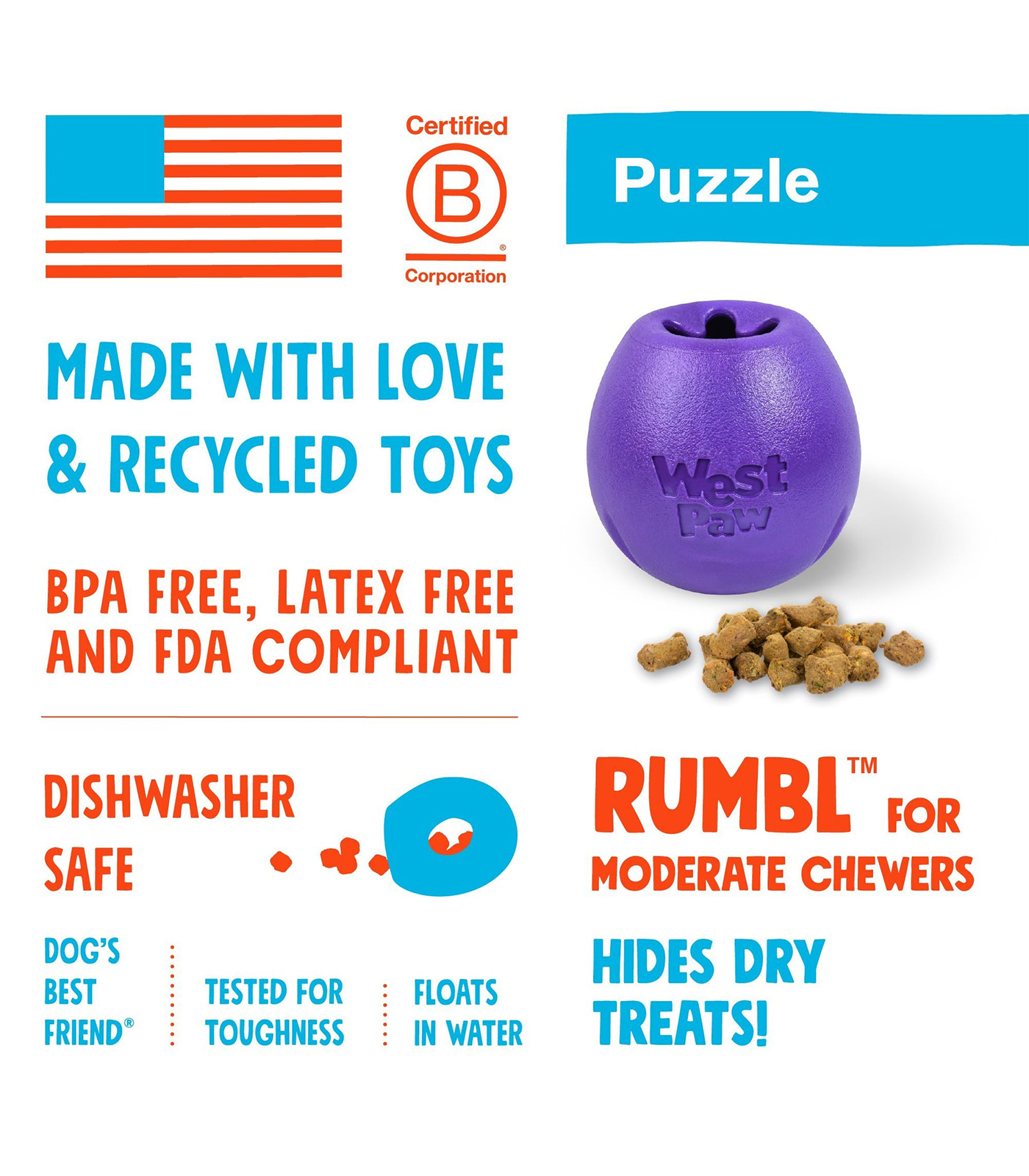 Super bouncy and crazy fun, West Paw?s dry treat-dispensing, puzzle dog toy, Rumbl, encourages healthy play. Rumbl’s unique ?fish trap? opening makes for easy loading, yet keeps dry food inside. Superior durability and hollow construction make this puzzle toy?s springy material heaven to a dog?s chompers while its playful wobble adds to the excitement and increases engagement.
