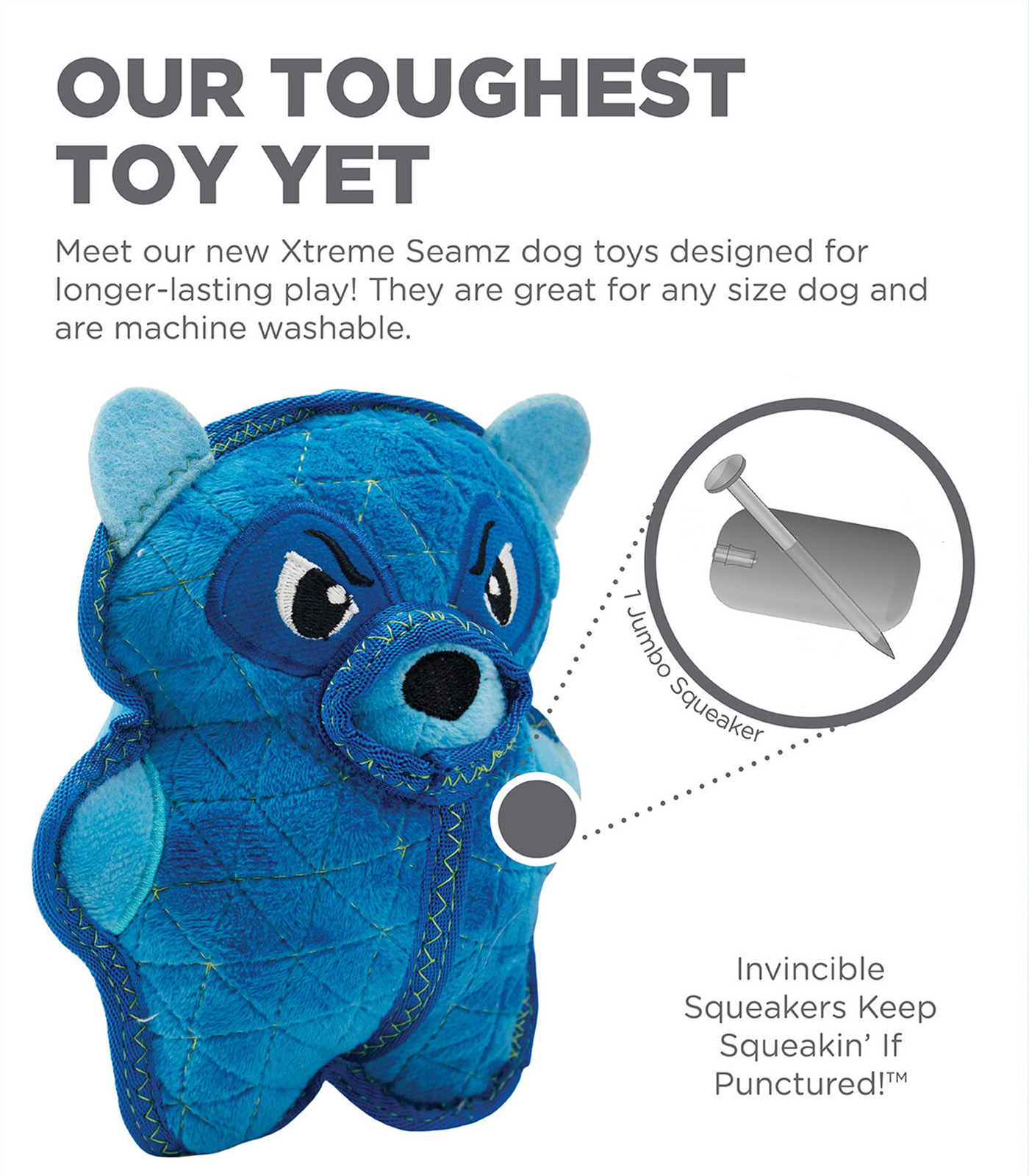 - our toughest toy yet:?Meet our new Xtreme Seamz dog toys designed for longer-lasting play! Our 8 NEW animal shapes with camo binding come in 2 different sizes making them a great toy for any size dog and are machine washable!